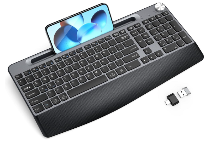 Ergonomic Wireless Keyboard, 2.4GHz Cordless USB Full-Size Keyboard with Wrist Rest, Quiet w. Numeric Keypad, Phone Holder compatible w. Mac, Windows-BLACK